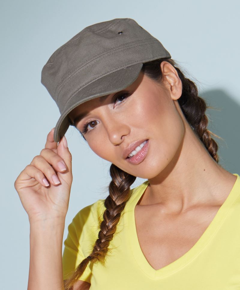 Udržitelný nástupce k modelu Army (artikl: 33.0519), předtvarovaný kšilt, vnitřní kšilt z recyklovaného plastu, středový šev, 4 ozdobné švy na kšiltu, boční větrací otvory, suchý zip, předepraný měkký materiál, štítek TearAway, ruční praní, nelze žehlit, nelze sušit v sušičce, nelze chemicky čistit