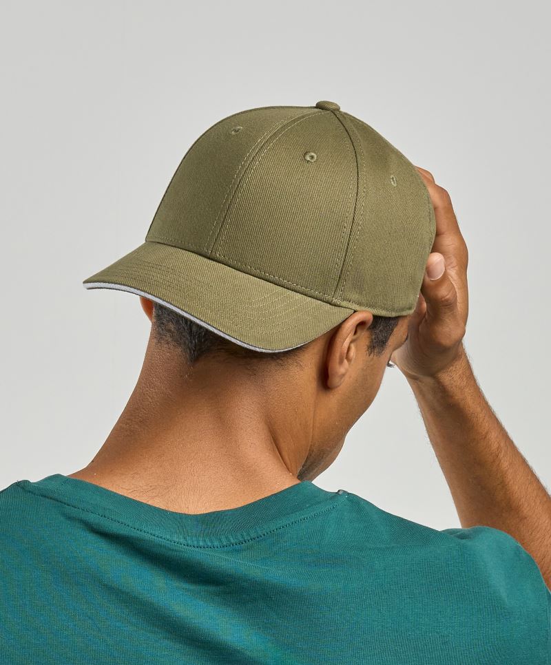 Obnovený udržitelný model Liberty Sandwich-S (artikl: 33.0251), lemování v kontrastní barvě na kšiltu, vyztužená přední část, obšité větrací otvory, látkový pásek s kovovým zapínáním, štítek Tear Away, ruční praní, nelze žehlit, nelze sušit v sušičce, nelze chemicky čistit