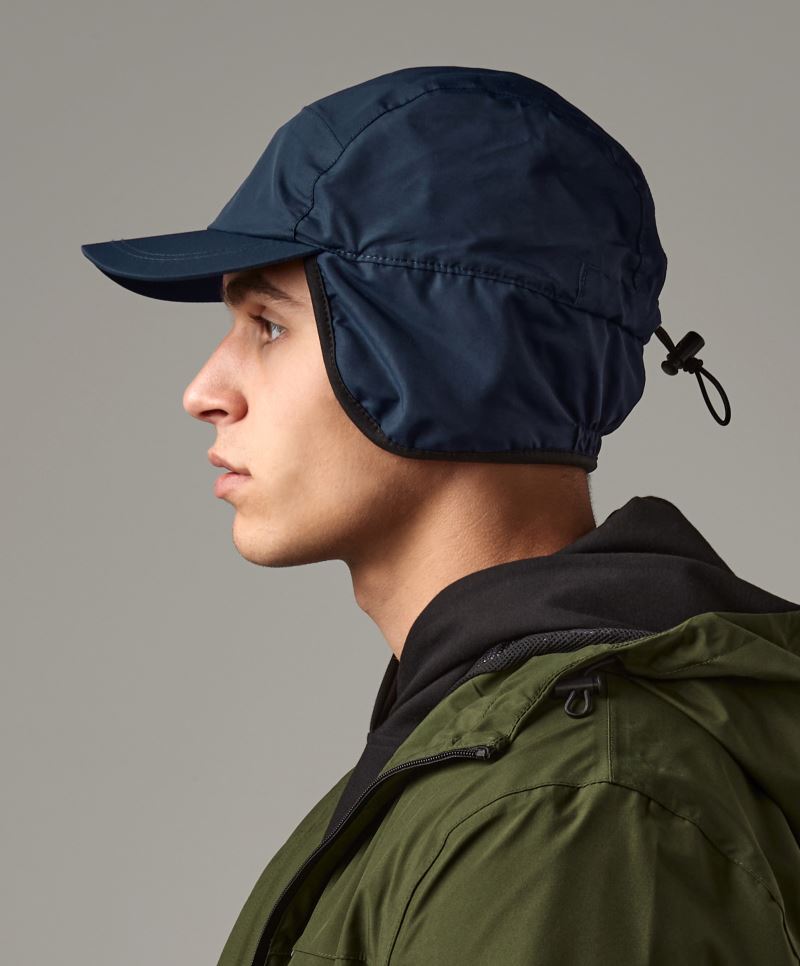 Obnovený udržitelný model Snow Flap Stopper-S (artikl: 33.0258), ohnutý kšilt, 4 ozdobných švů na kšiltu, potítko z bavlny, zavírání na šňůrku a plastovou zarážku, optimální ochrana proti chladu, materiál odolný proti větru, integrovaná ochrana uší, kterou lze složit, štítek TearAway, ruční praní, nelze žehlit, nelze sušit v sušičce, nelze chemicky čistit