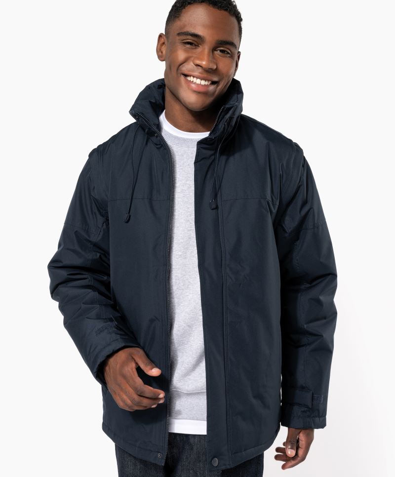 Voděodpudivý materiál, límec s integrovanou kapucí, nastavitelné manžety na rukávech, plný skrytý zip, 2 vnější kapsy, vnitřní podšívka ze síťoviny, elastická šňůrka, přístup k zušlechtění v zadní části, s termo podšívkou z kartáčované trikotové tkaniny