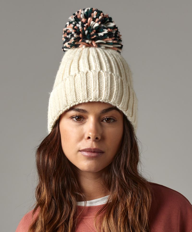 1-vrstvý žebrovaný úplet, flexibilní ohrnutý lem, bambule tón v tónu, štítek TearAway, ruční praní, nelze žehlit