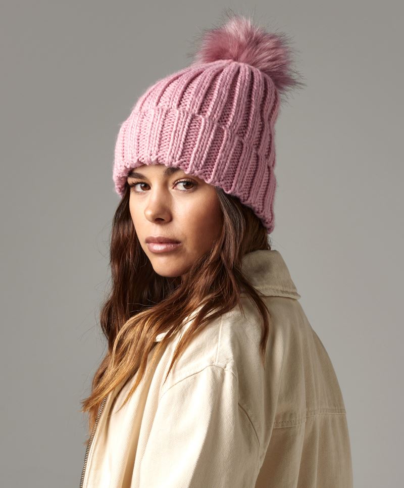 Unisex, luxusní robustní žebrovaný úplet, ohrnutý lem, odnímatelná bambule z umělé kožešiny, štítek Tear Away, ruční praní, nelze žehlit, nelze sušit v sušičce, nelze chemicky čistit
