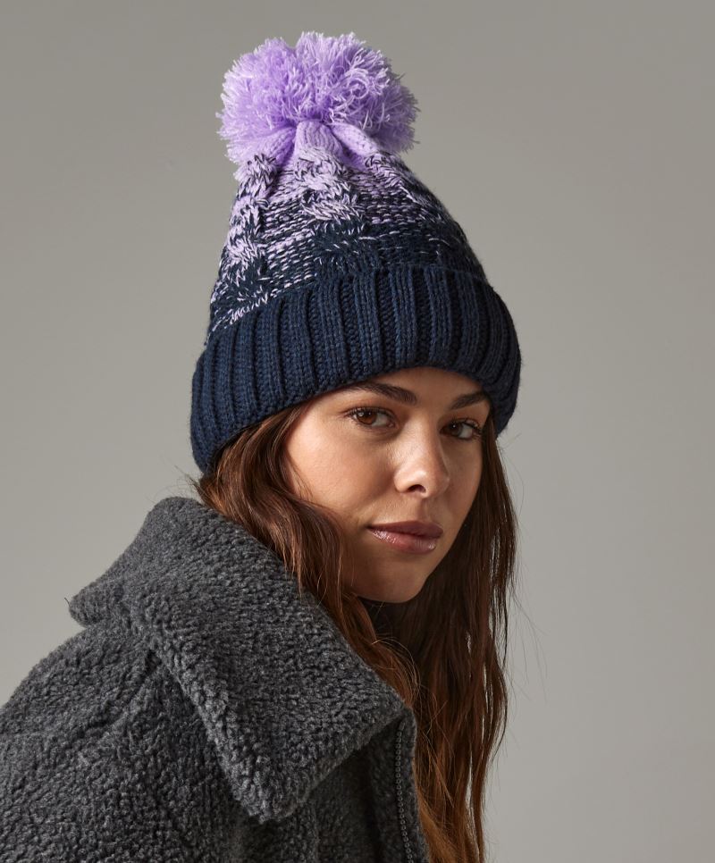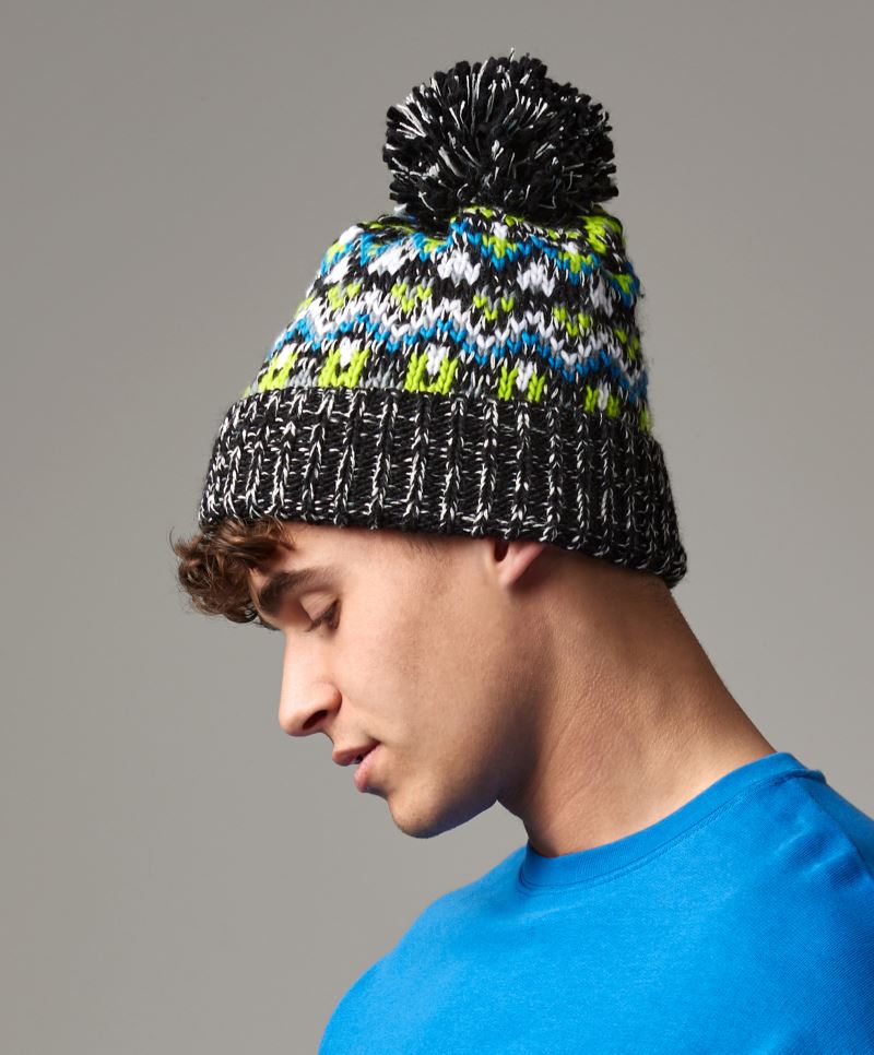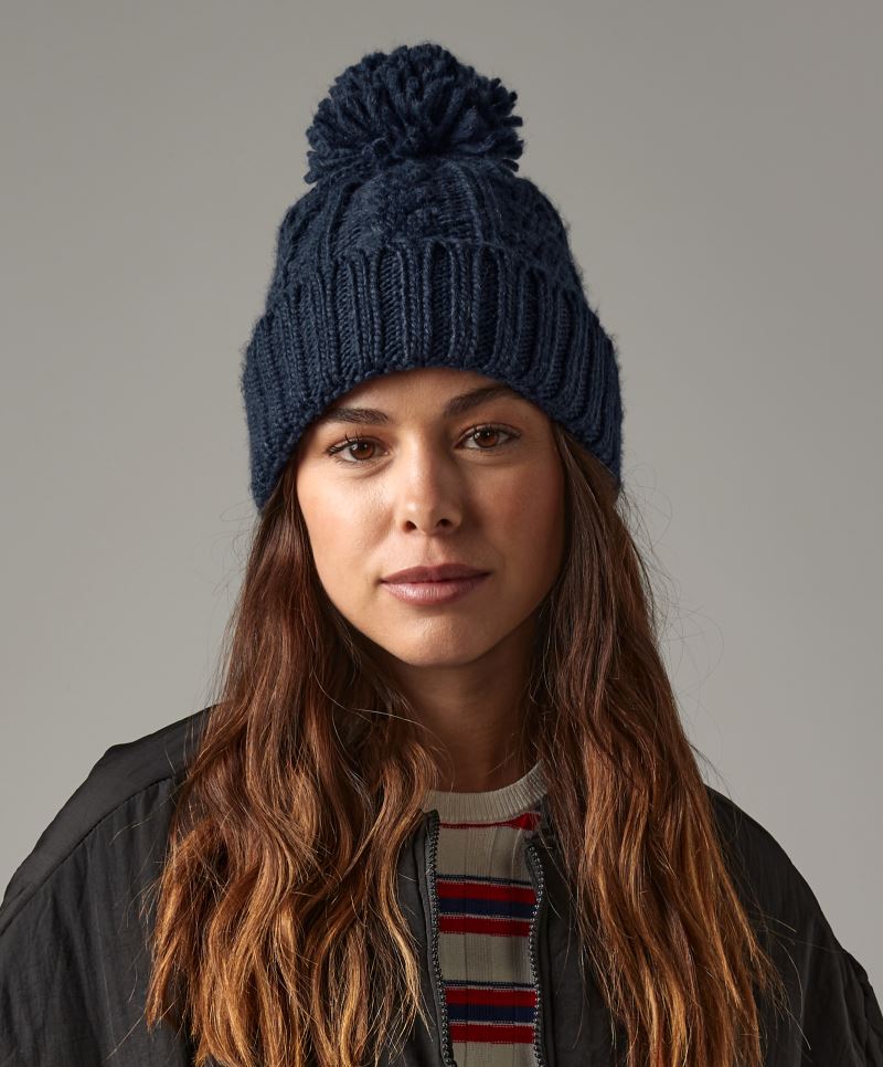 Flexibilní ohrnutý lem, uvnitř termopáska z umělé jehněčí kůže, 2-barevné, s bambulí, robustní úplet s copánkovým vzorem z více přízí, štítek TearAway, ruční praní, nelze žehlit