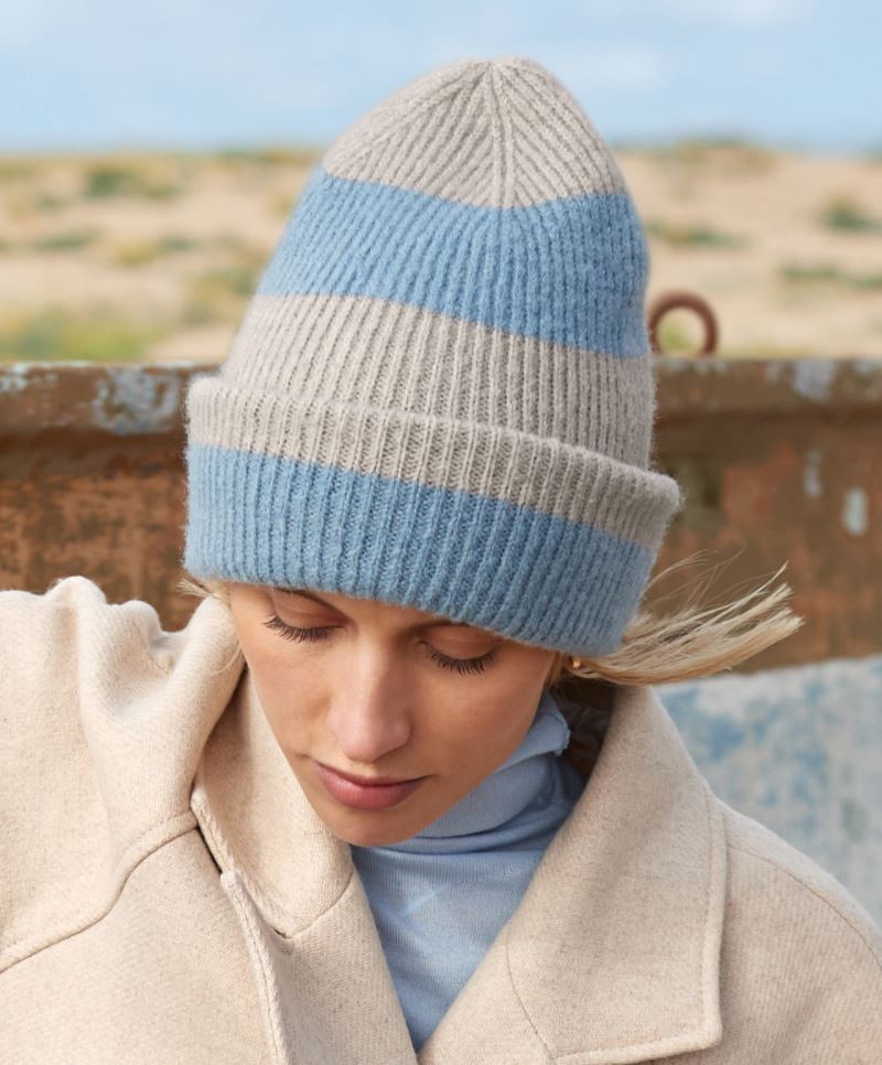 Jednobarevná bambule, široký lem, pruhovaný design, dvojitě pletená, měkká a teplá, štítek TearAway, ruční praní, nelze sušit v sušičce, nelze chemicky čistit