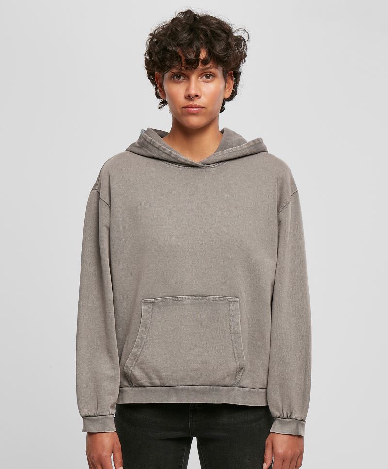 Oversize, kapuce bez šňůrky, Kapuce s dělícím švem, přesahující ramena, široké žebrované manžety na rukávech a lemu, speciální úprava pro dosažení sepraného vzhledu - tento proces vede k barevným odchylkám, neutrální velikostní štítek, pratelné na 30°, nelze sušit v sušičce