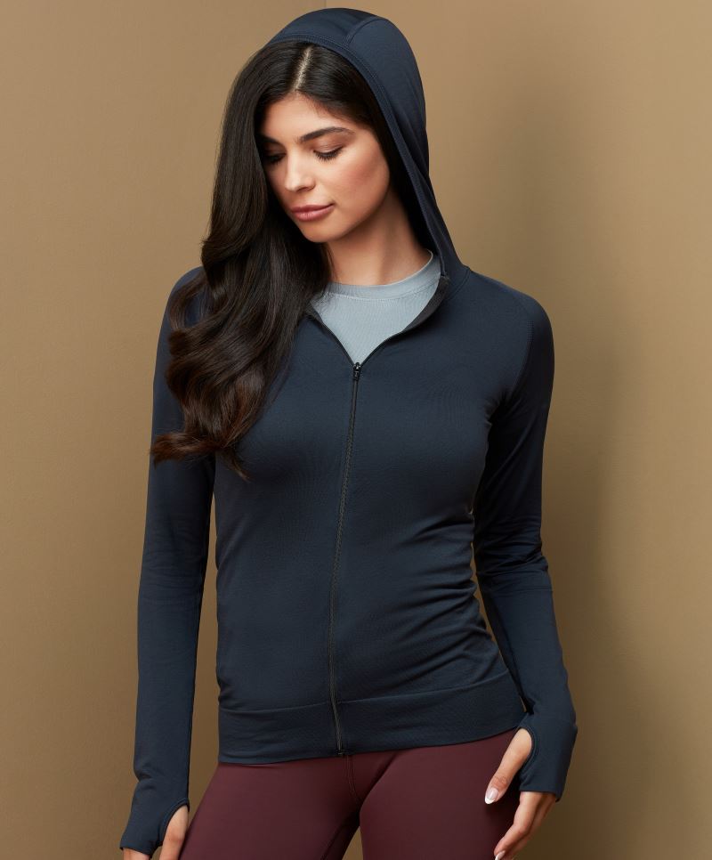 Elastické manžety s poutky na palec, celopropínací zip, 2 boční kapsy se zipem, regulující vlhkost, odolný pružný materiál, pratelné na 40°, lze sušit v sušičce při nízké teplotě