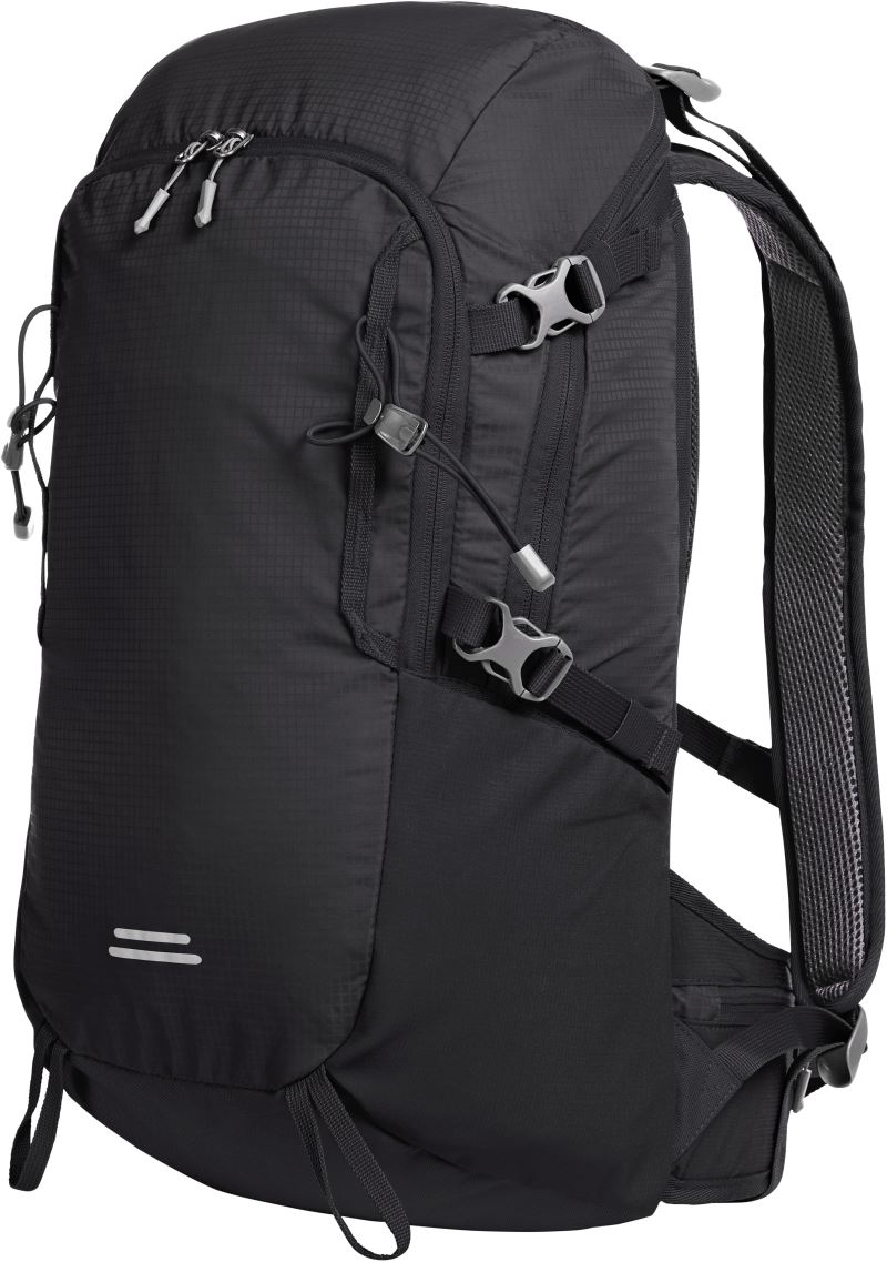 Nastavitelné a polstrované ramenní popruhy, velká přední kapsa na zip se zasouvacími přihrádkami a výstupem pro sluchátka, uvnitř plochá zasouvací kapsa, hlavní přihrádka s 2-cestným zipem, boční síťované příhrádky, polstrovaná záda, boční upínací popruhy, reflexní pruhy (bez ochranné funkce), objem 22l, rozměry: 34x49x18,5cm