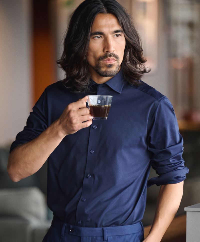 Klasický střih, skrytý button-down límec typu cutaway, sedlo, nastavitelné manžety se 2 knoflíky, záševky na zádech, pružný materiál, tkanina pro snadnou údržbu, vyrobeno z dlouhovlákné bavlny, pratelné na 40°, snadné žehlení, nelze sušit v sušičce