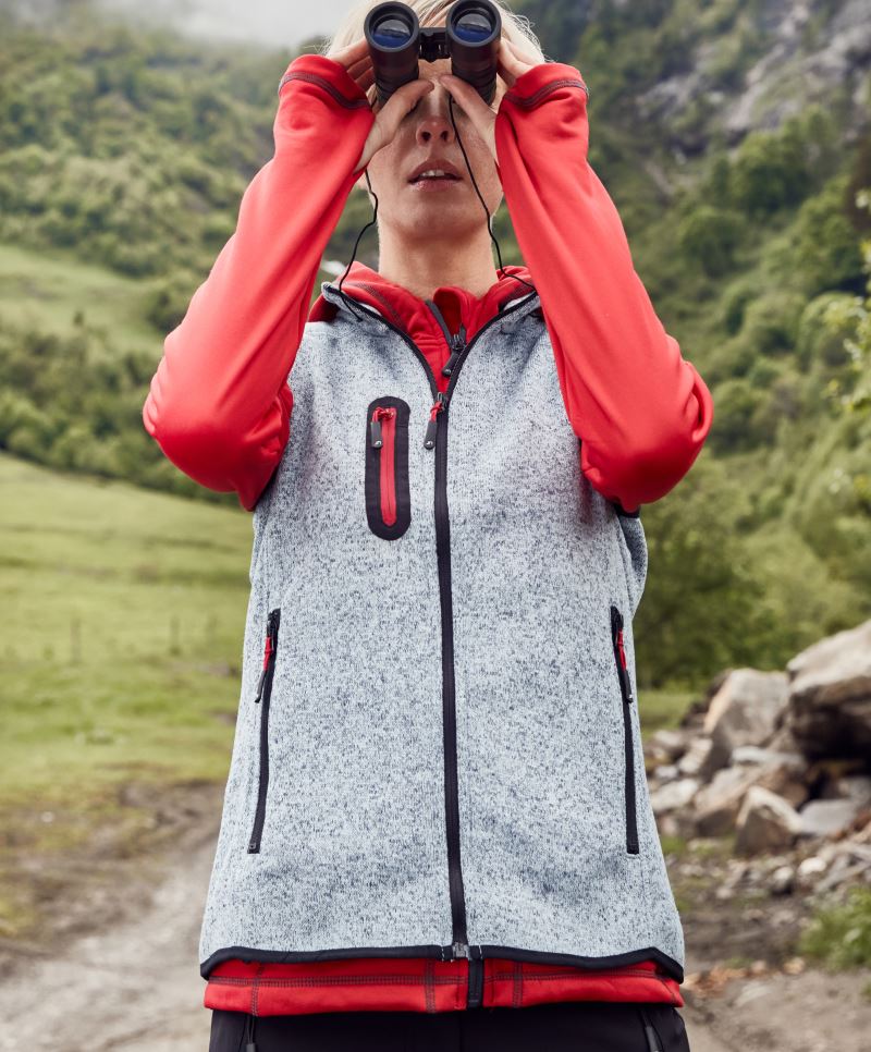 Náprsní kapsa, boční kapsy se zipem, dělící švy zdůrazňující postavu, lemování v kontrastní barvě na průramcích a lemu, pletený vzhled, uvnitř počesaná, pratelné na 30°, šetrné praní, nelze sušit v sušičce