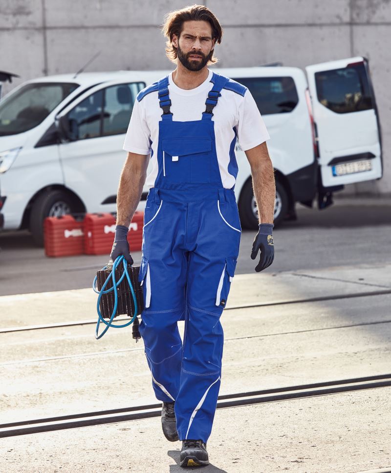 Pohodlné nošení díky ergonomickému střihu a podílu elastanu, nastavitelný lacl s elastickými popruhy, elastický pas s poutky na opasek, zakryté knoflíky a zipy, zasouvací kapsy, různé kapsy na nářadí, kapsa na pravítko, kapsa na mobilní telefon a kapsa na pero, prostorná kapsa se zipem uvnitř na laclu, 3-tý šev odolný proti roztržení, elastické lehké kvalitní plátno, reflexní prvky (bez ochranné funkce) na přední a zadní straně, pratelné na 60°, lze sušit v sušičce při nízké teplotě, velikost 62 Art.č. 02.848X