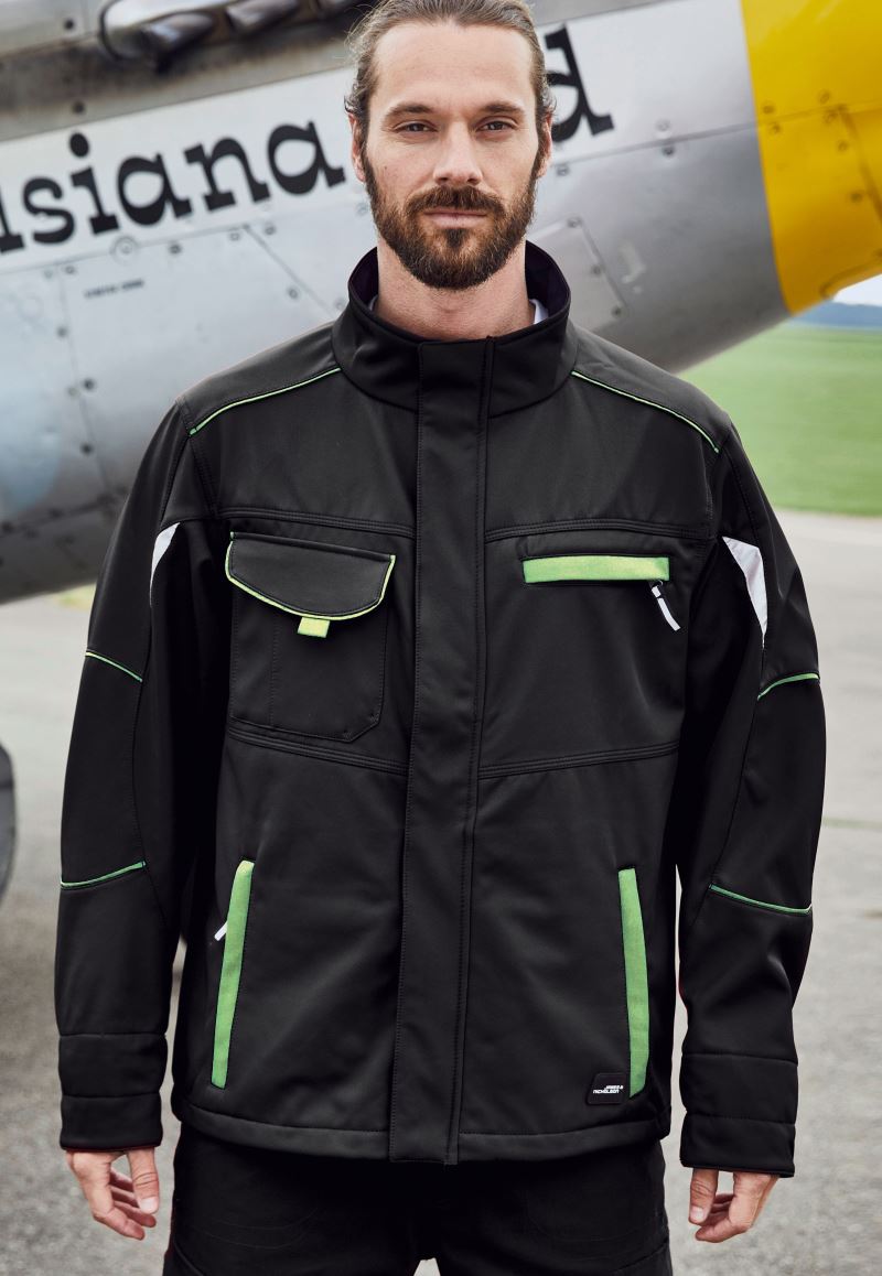Větruodolná a voděodpudivá (2.000mm vodní sloupec), prodyšná a propustná pro vodní páry (2.000g/m² za 24h), stojáček, ergonomicky tvarované rukávy, vnitřní manžeta na rukávu, plný podšitý zip s větrnou clonou a ochranou brady, zakryté knoflíky a zipy, boční kapsy, náprsní kapsa a vnitřní kapsa se zipem, náprsní kapsa s klopou, uvnitř kapsa na mobilní telefon, prodloužená záda, robustní a odolný softshellový materiál, reflexní prvky (bez ochranné funkce) na přední a zadní straně, pratelné na 30°, nelze žehlit, nelze sušit v sušičce