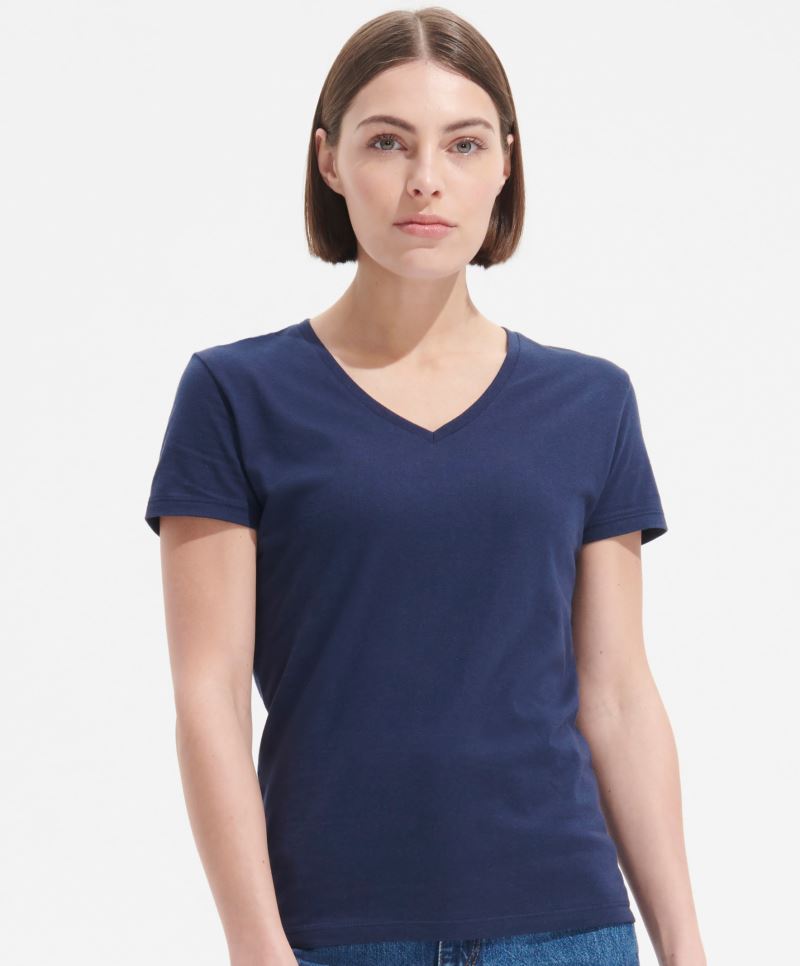 Vypasovaný střih, úzce lemovaný hluboký výstřih do V, krční lemovka v kontrastní barvě (šedá) u barevných triček a bílá u bílých triček, dvojité švy, pratelné na 40°, lze sušit v sušičce při nízké teplotě, nelze chemicky čistit