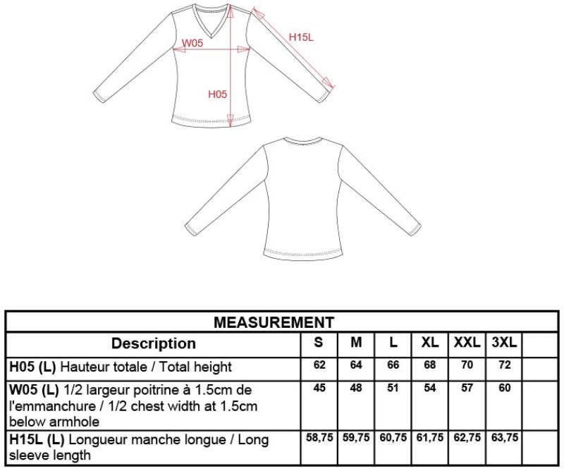 Vypasovaný střih, úzce lemovaný výstřih do V, krční lemovka v kontrastní barvě (šedá) u barevných triček a bílá u bílých triček, dvojité švy, pratelné na 40°, lze sušit v sušičce při nízké teplotě, nelze chemicky čistit