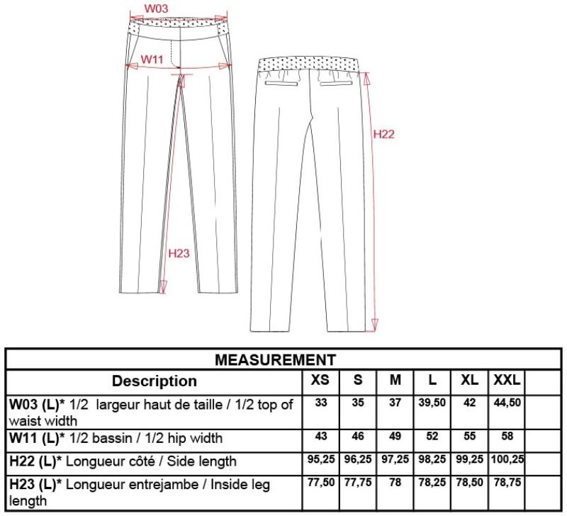 Úzký střih, elastický pás vzadu pro optimální pohodlí, nohavice s neviditelnými lemy, zip se skrytým háčkem a knoflíkem, 2 šikmé kapsy vpředu a 2 zadní kapsy s lemováním, pratelné na 40°, chemické čištění, nelze sušit v sušičce, vnitřní délka nohavic 30 palce (78cm)