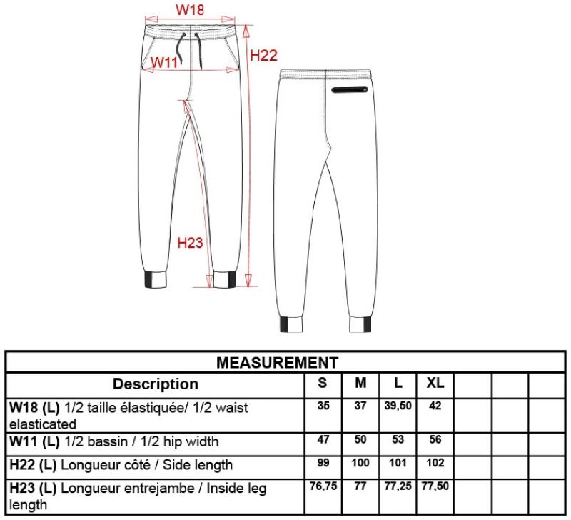 Úzký střih, elastický pas s 2-barevnou šňůrkou, úzké ukončení nohavic s elastickou vložkou v kontrastní barvě, kolenní vsadky, 1 tepelně lepená kapsa na zip vzadu, 2 přední kapsy s žerzejovou podšívkou z 65% polyesteru, 35% bavlny, pratelné na 40°, nelze sušit v sušičce, nelze chemicky čistit
