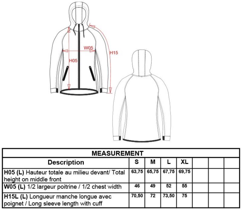 79% polyester, 15% viskóza, 6% elastan, kapuce: 65% polyester, 35% bavlněná žerzejová podšívka