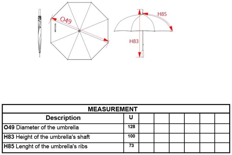 EVA rukojeť, laminátový rám a hůl, plastové špičky, odolný bouřce, REACH standard, manuální otevírání, průměr: 128cm