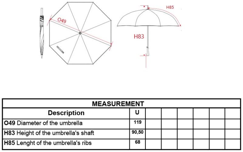 Polykarbonátová golfová rukojeť v pogumovaném provedení, černá kovová tyč o tloušťce 14mm, černé paprsky ze skleněných vláken, konce paprsků z kovu, nahrazuje Kimood 2002, automatická funkce, průměr: 120cm, nesmí se prát, nelze sušit v sušičce, nelze chemicky čistit