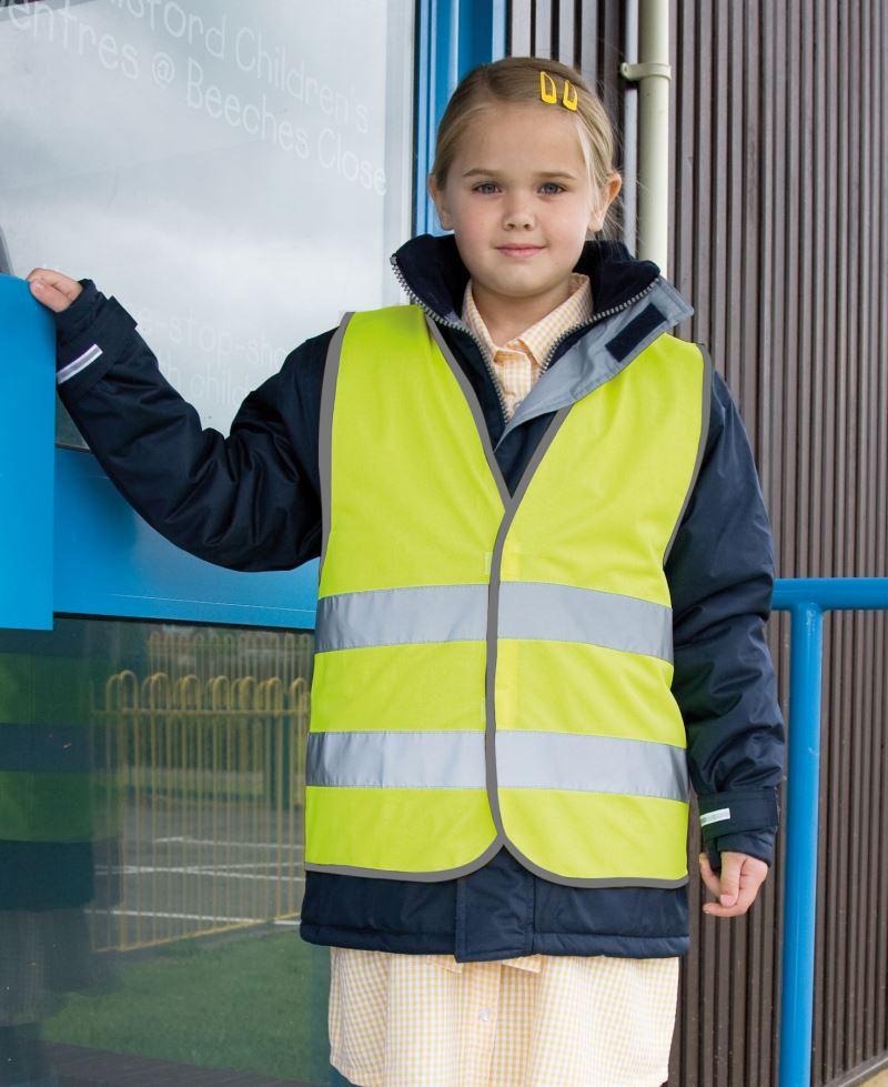 Nastavení velikosti pomocí 2 suchých zipů, certifikováno podle EN 17353 typ B3 (viditelnost za tmy), dva reflexní pruhy široké 5 cm kolem těla, XS 3-6 let, S - 7-12 let