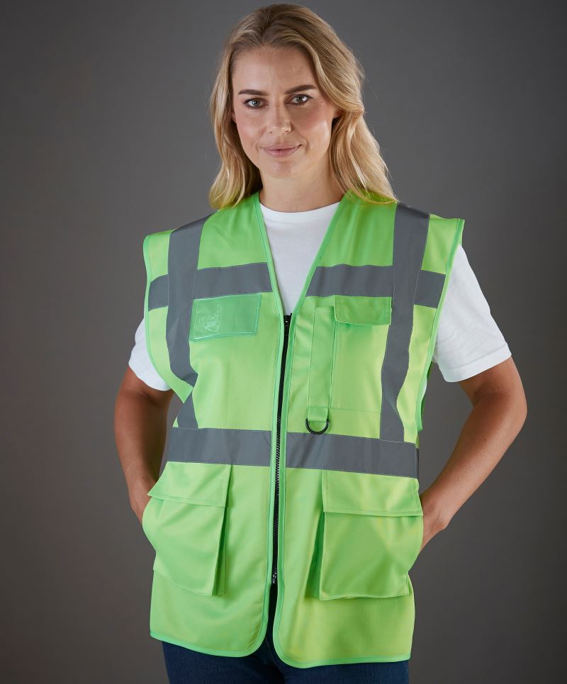 Celopropínací zip přední, 2 kapsy s klopami na suchý zip, kapsa na doklady, kapsa na smartphone, přihrádka na pero, kroužek na klíče, neon pink a neon green certifikace EN 17353 typ AB3 (viditelnost za denního světla a tmy), yellow, orange, yellow/orange und yellow/blue odpovídají normě EN ISO 20471, všechny ostatní barvy odpovídají normě EN 17353 typ B3 (viditelnost za tmy), čtyři reflexní pruhy široké 5 cm