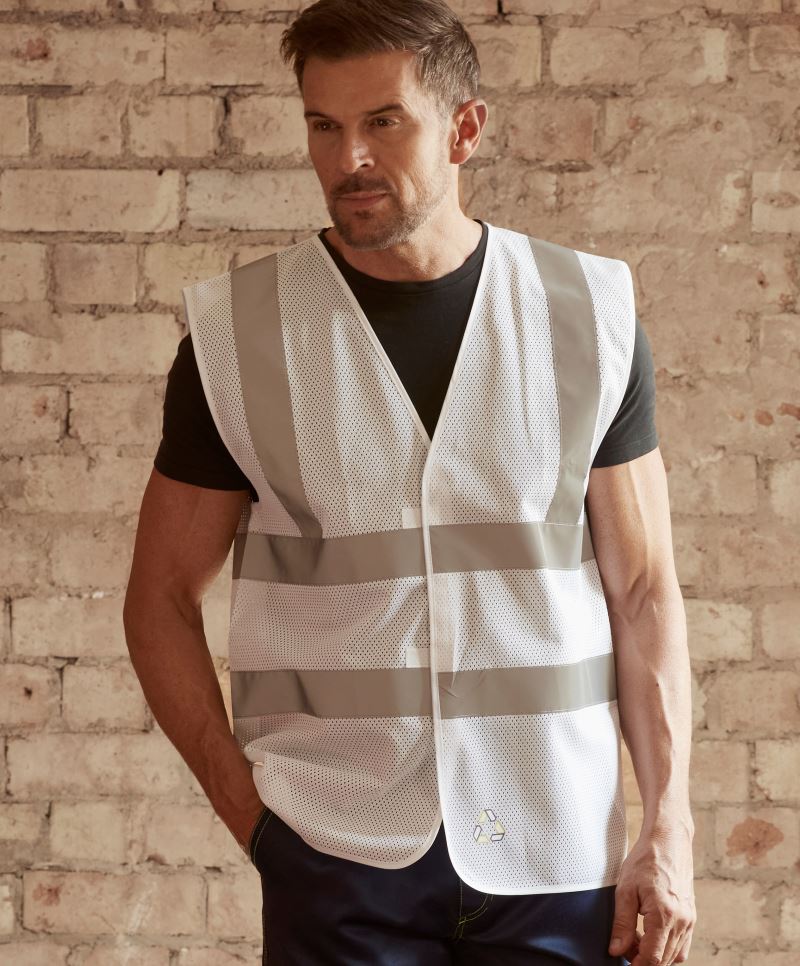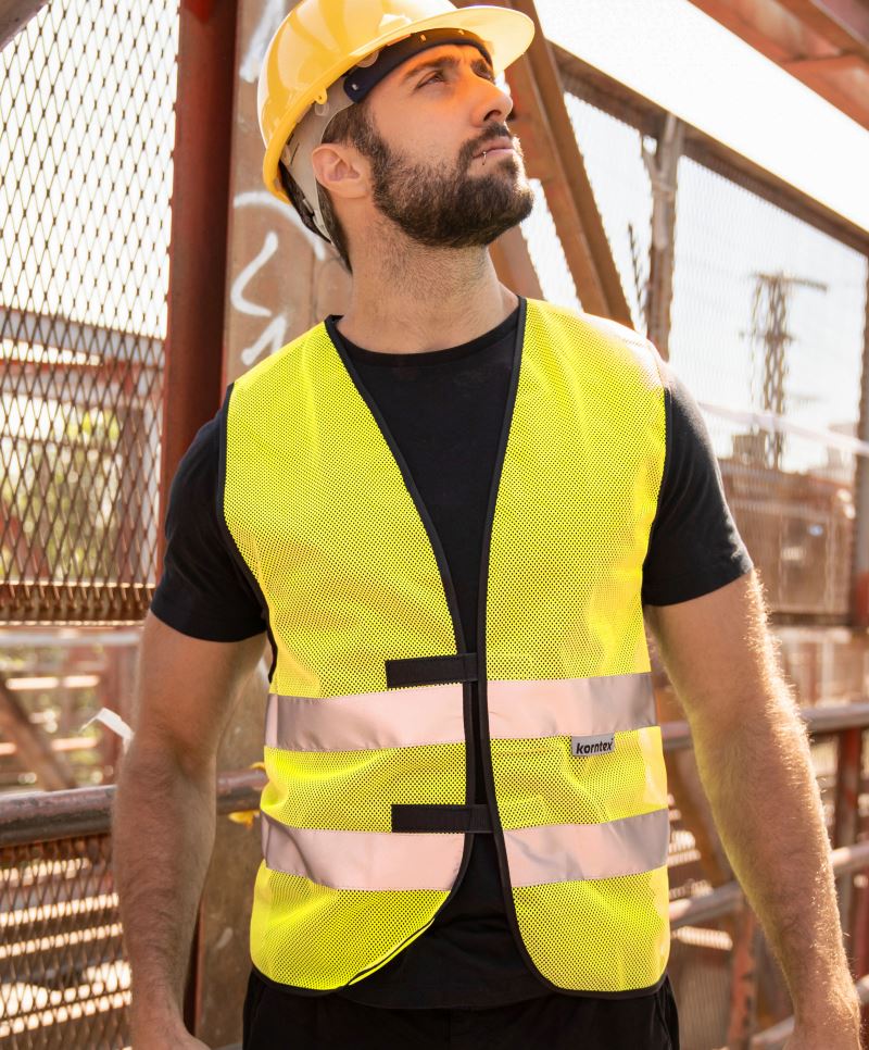 Velmi prodyšná, lemovaná černým polyesterovým lemem, nastavení velikosti pomocí 2 suchých zipů, ideální pro horké pracovní prostředí, certifikováno podle EN 17353 typ B3 (viditelnost za tmy), dva reflexní pruhy široké 5 cm kolem těla (bez ochranné funkce)