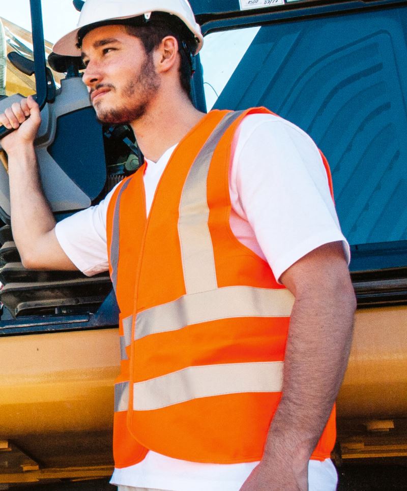 Lemovaná černým polyesterovým lemem, nastavení velikosti pomocí 2 suchých zipů, certifikováno podle EN ISO 20471, neon pink a neon green certifikace EN 17353 typ AB3 (viditelnost za denního světla a tmy), dva reflexní pruhy široké 5 cm