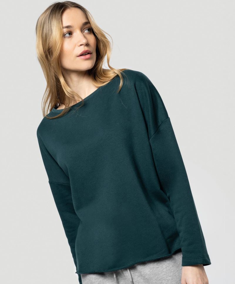 Krátký střih, oversize, půlměsícová podsádka na krku, krční lemovka, přesahující ramena, 2x2 žebrované manžety na výstřihu, rukávech a lemu, 3-vrstvá kvalitní teplákovina, povrch ze 100% bavlny, uvnitř počesaná, štítek Tear Away, pratelné na 30°, šetrné praní, lze sušit v sušičce