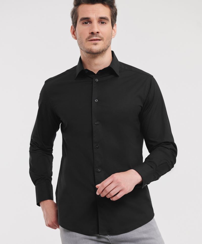Lehce vypasovaný střih, žraločí límec, knoflíková léga bez viditelných švů, zaoblený lem, Easy Care, pratelné na 40°, nelze sušit v sušičce