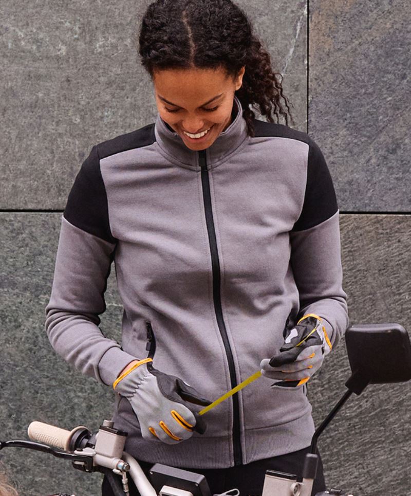 Stojáček, krční lemovka v kontrastní barvě, manžety a pas v 2x2 žebrovaném úpletu s elastanem, 2 boční kapsy se zipem, barevný kontrast na ramenou, vnitřní straně rukávů a zipech, uvnitř počesaná, pratelné na 60°, lze sušit v sušičce při nízké teplotě, nelze chemicky čistit, vhodné pro průmyslové praní, kapsa pro všití pracího čipu do bočního švu