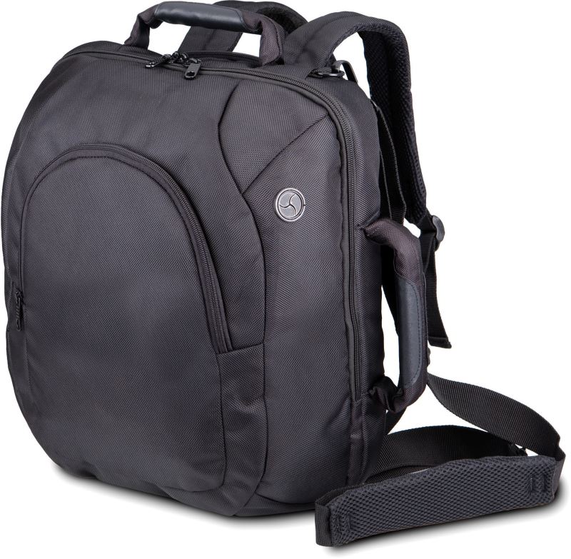 Voděodpudivý materiál, držadlo, nastavitelné a polstrované ramenní popruhy, přední kapsa na zip, integrovaná bezpečnostní kapsa, vzadu poutko, zasouvací kapsy, velká hlavní přihrádka, polstrovaná přihrádka na notebook vhodná pro notebooky do max. 16", štítek Tear Away, objem 16l, rozměry: 41x37x11cm, pouze čistit houbičkou