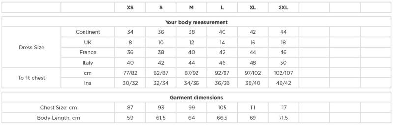 Vypasovaný střih, pletený límec, knoflíková léga s 2 knoflíky, krční lemovka a boční rozparky s vnitřní výztuží ve vzhledu rybí kosti, otevřené rukávy s dvojitými švy na manžetách, 1 náhradní knoflík, pratelné na 60°, lze sušit v sušičce