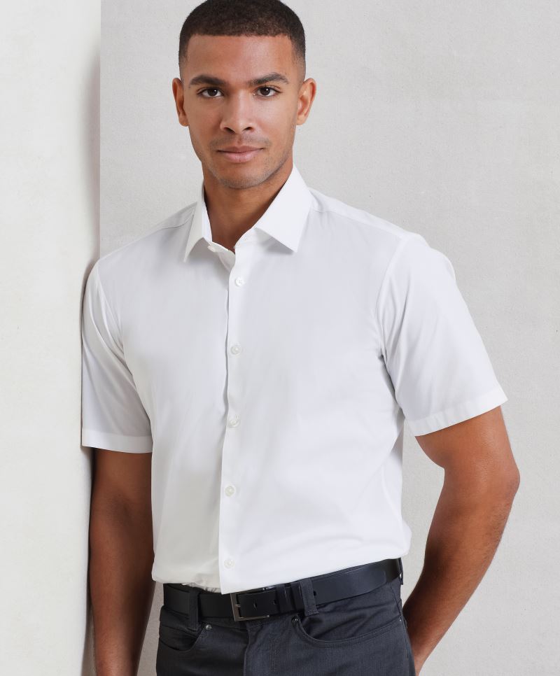 Vypasovaný střih, elegantní částečně rozšířený límeček s jedním perleťovým knoflíčkem, zaoblený lem, náhradní knoflíky, bez náprsní kapsy, Easy Care, pratelné na 40°, lze sušit v sušičce
