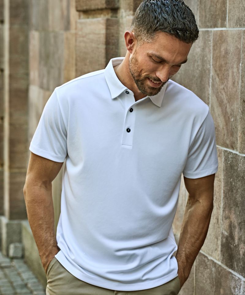 Žebrovaný pletený límec, zesílená knoflíková léga se 3 knoflíky tón v tónu, krční lemovka, vhodné pro sublimační tisk, štítek Tear Away, pratelné na 60°, nelze sušit v sušičce, nelze chemicky čistit