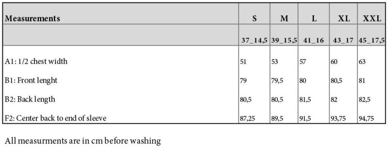 Vypasovaný střih, zaoblený límec a manžety, odnímatelné kostice límečku, mírný žraločí límec, zaoblený lem, záševky na zádech, zadní sedlo, Easy Care, snadné žehlení