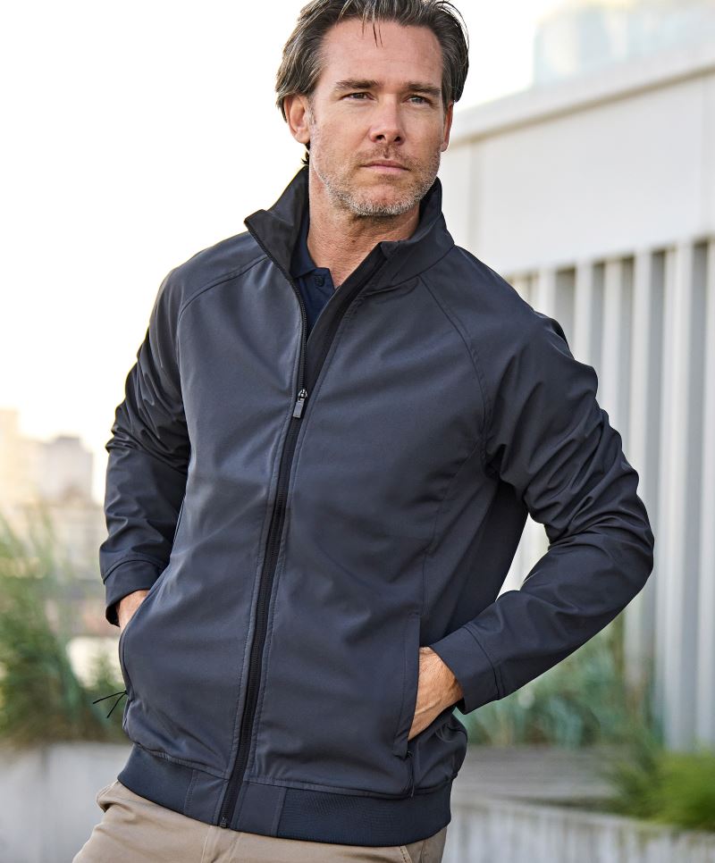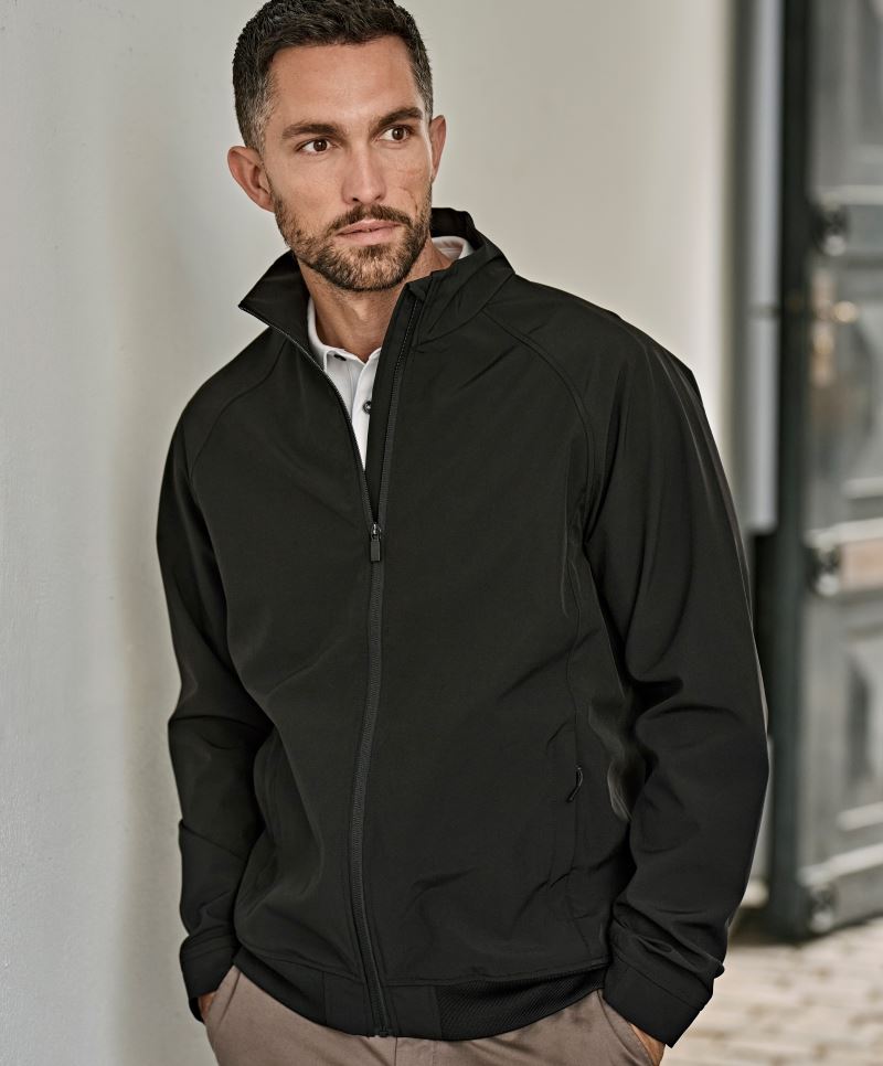 Vypasovaný střih, prodyšný materiál, plochý pletený límec, knoflíková léga se 3 knoflíky tón v tónu, elastické manžety na rukávech, boční rozparky, regulující vlhkost a rychleschnoucí